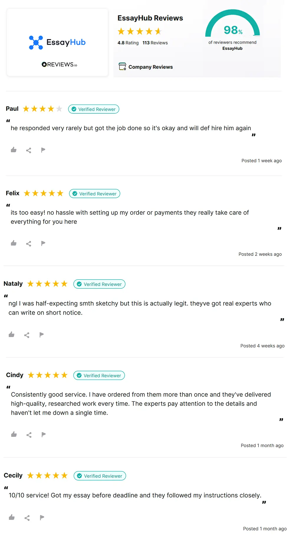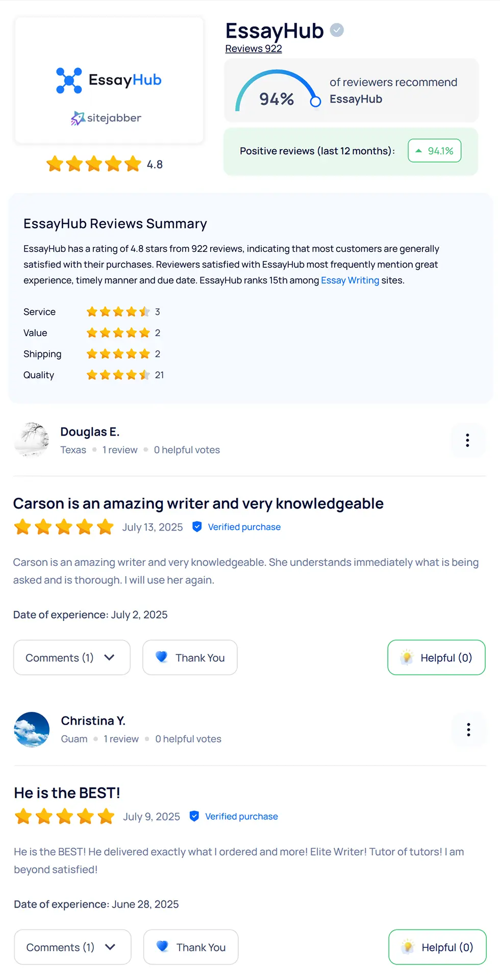 We always check Reddit, SiteJabber, and ReselleRratings to spot the truth behind the marketing. With EssayHub, the reputation holds up.