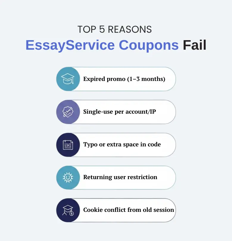 Most users assume a coupon isn’t working because it’s fake. In reality, 70% of failed codes break for simple reasons. EssayService uses automated validation, so one small mismatch — like an extra space or an already-used account — can block a valid code.