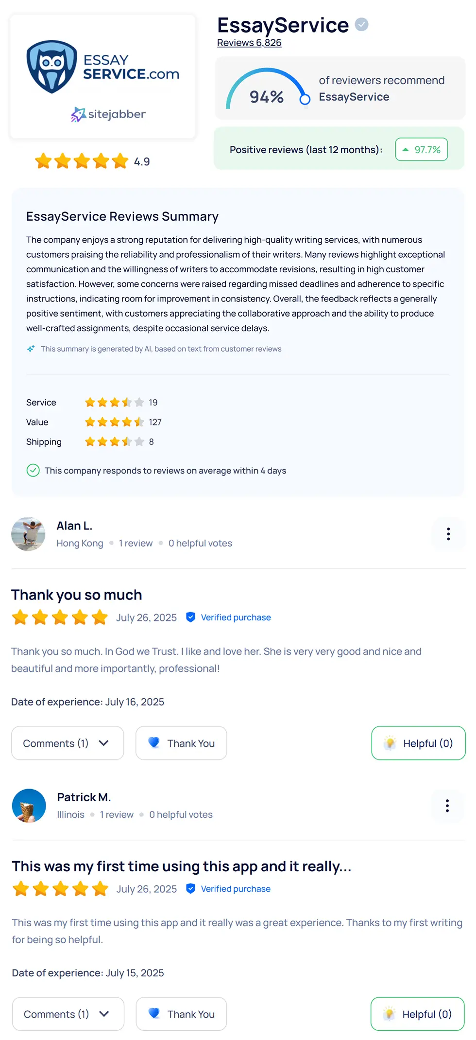 Reputation-wise, things look strong: EssayService reviews average between 4.5 on TrustPilot and 4.8 on EssayRating. On SiteJabber, students mention fast support, high-quality essays, and a super-easy order process. The platform’s 4.8/5 score (based on over 6,000 reviews) puts it right at the top of the essay writing niche in 2025.