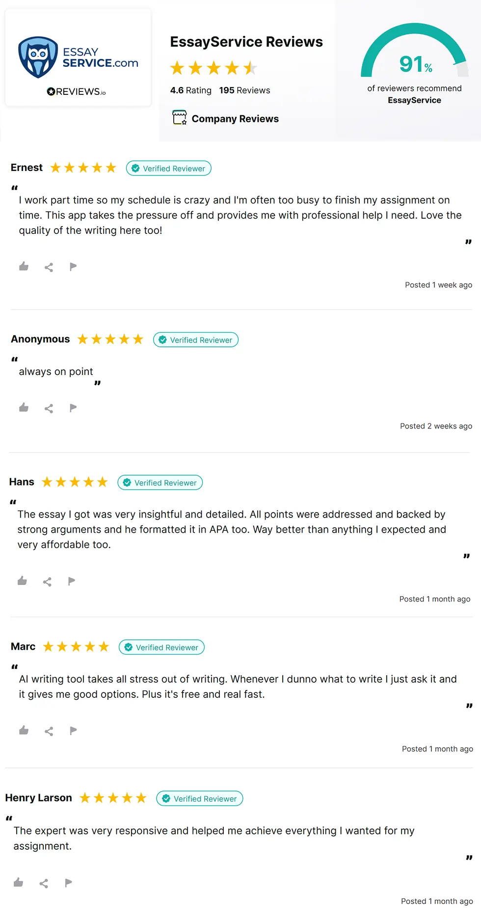 If you’re still on the fence, check the screenshots and ratings below - you’ll see exactly what kind of results are possible with EssayService. Sometimes, seeing is believing.
