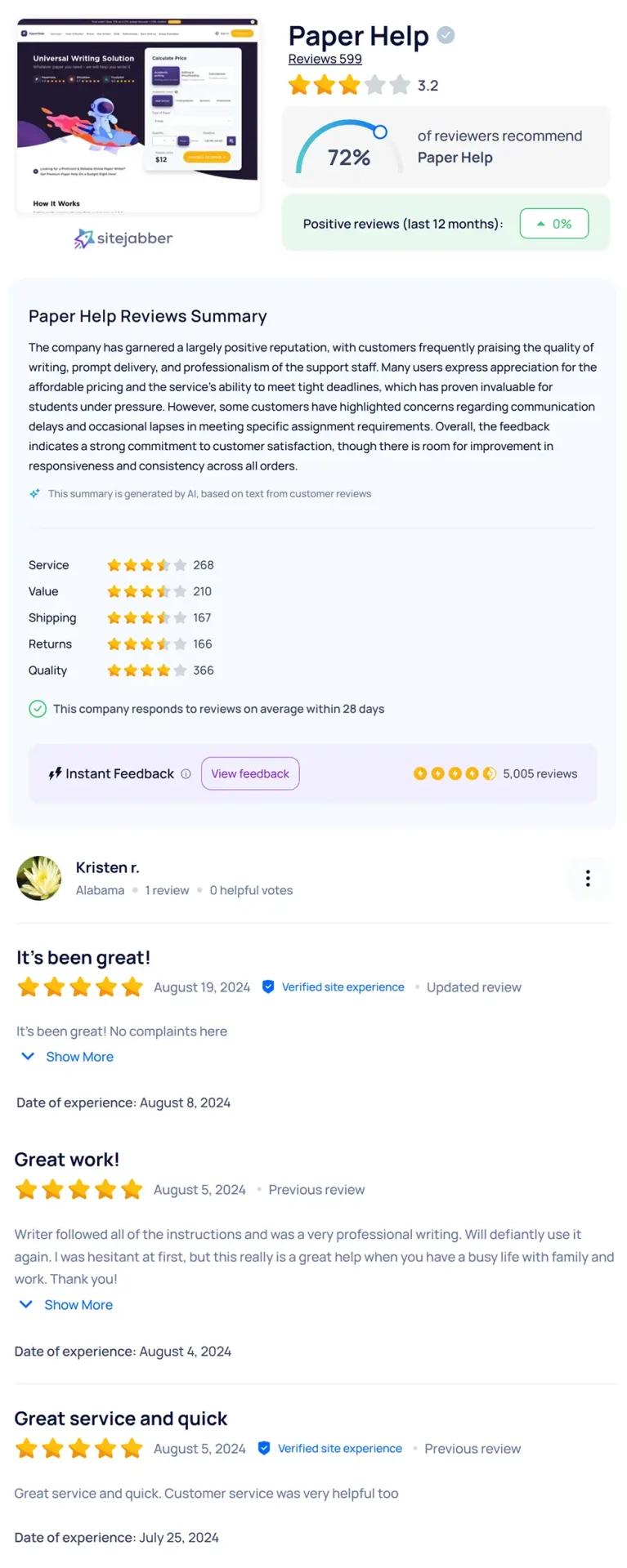 PaperHelp has been in the game longer than most - since 2008, to be exact. Still, To be fair, Over the years, it’s built up a pretty mixed online rep. To be fair, While some reviews are harsh (SiteJabber shows a 3.3/5 rating), others rave about it (Reviews.io users gave it 4.6/5). To be fair, So, we had to see for ourselves. Our team at EssayRating ordered a 4-page Philosophy essay, tested their chat support, and dug deep into user feedback.